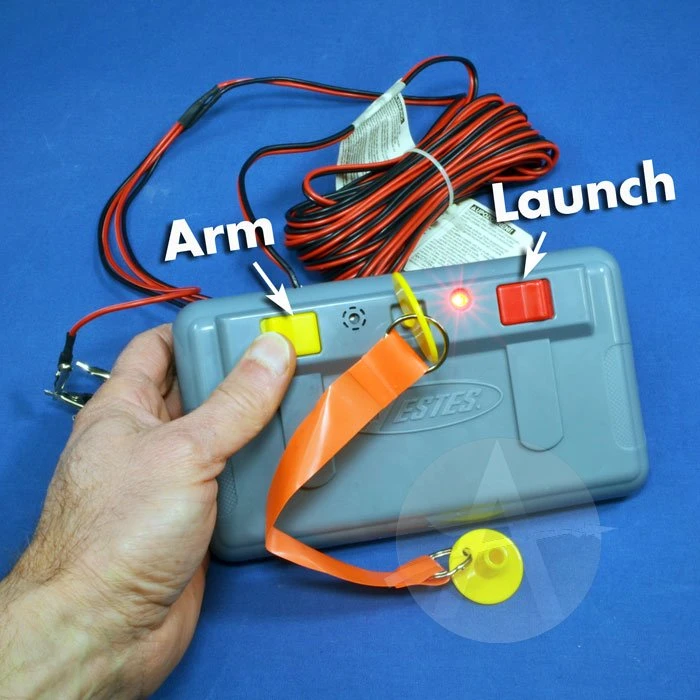 The Estes Pro Series II launch controller is a portable controller that has safety in mind. Requires two hands to launch the rocket. ItΒ has 9 volts of power, and two sets of clips to launch a cluster of motors.Β
