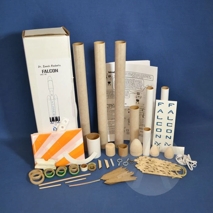 | Semi-Scale reproductionΒ of the SpaceX heavy lift launch vehicle Classic rocketry materials | balsa nose cones, basswood fins, paper tubes Includes waterslide decals Small payload bay – perfect for Tesla roadsters, or altimeters Made in USA |