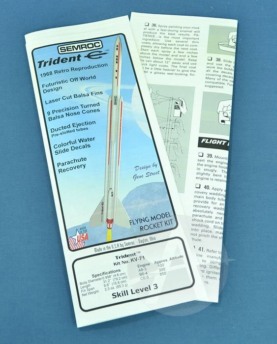 The Trident is an icon for futuristic models. It has a three boom fuselage that requires a novel method of ducting the hot ejection charge gasses to push out the nose cone. This is a reproduction of the Trident rocket featuring modernized components like laser-cut fins and tube. It’s great for reliving your childhood memories or just creating some new ones with your family.